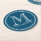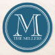 Modern Classic Name Monogram round coaster featuring a classic white round border with an editable background colour (click customise it to access). This personalised round monogrammed coaster looks great for your home, diner or bar.