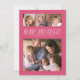This photo holiday card features four of your photos and the words "Merry and Bright" in a trendy handwritten-like serif font against and editable background on the front (click customise, select the "MerryandPhotoCard1" element and change its fill colour). Card has a white rough circle pattern against an editable background colour back side (click customise, select back layer background colour and change it).