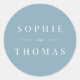 This wedding sticker features the names of the wedding couple in white against an editable background colour; to change it from dusty blue to a colour of your choice, click the customise button.