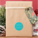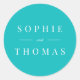 This wedding sticker features the names of the wedding couple in white against an editable background colour; to change it from turquipse to a colour of your choice, click the customise button.
