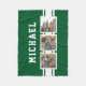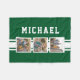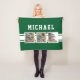 A sporty varsity style blanket with 3 photos arranged one below the other in front of a line of white stripes all against an editable background colour (click "customise" to change background colour).