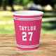 Stylish varsity style paper cups featuring your name number with fully editable colours. Font colours can be change by clicking on customise, select the texts in the "Auto Warping, Front" and "Auto Warping, Back" layers and change its colour . Stripes colour can be changed by clicking on customise and changing the colour of "line" in the "Auto Warping, Wrap" layer and background colour can also be changed on the same layer. They make the perfect paper cups for birthdays, graduation or celebrating your athlete's achievement.