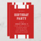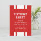 Varsity birthday party invitation with the words "Birthday Party" in a varsity collegiate style in white against a white stripes pattern and an editable background colour (click customise to change) on the front that is perfect for celebrating any age. Card has a white stripes pattern against an editable background colour (click customise to change) for the back side.