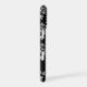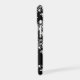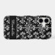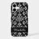 An editable iPhone case with elegant script letters in white on a black ribbon and a floral damask pattern in back on white.