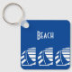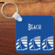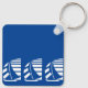 A custom beach, pool or slip editable key-chain with art deco letters and a pattern of white sailboats sailing across windy ocean waves, on a deep blue background.