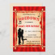 This editable hoedown shindig country western birthday invitation features a silhouette of a cowgirl and cowboy dancing and musical notes against a framed banner in front of a red sunburst pattern. The details are editable so go ahead and change the information as well as the font style, size and colour. On the back is an editable field for additional information.