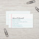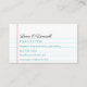 This editable business card features a lined notebook paper with the editable business details on it. The font style, size and colour of the font can be changed. On the back of the card, is an editable field for additional information.