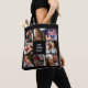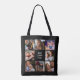 Editable photo collage tote bag featuring a black background, 8 family photos, and a text template that is easy to personalise.