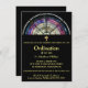 This beautiful religious event invitation card features a stained glass semi-circle with a black background. The stained glass is in Rome, Italy. Below is a gold cross and the details of the event. This card is shown for an ordination but it can also be used for a nun's final vows, ordination anniversaries, priests' retirements, confirmation, baptisms, First Holy Communion etc. Photo credit: Sandro Pacilli, 2020.