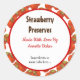 A custom canning, jam or baking label with retro script and block letters for your business or name and contact info on a background pattern of bright red strawberries.