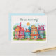 This postcard features an illustration of whimsical houses. Above it , it says, "We're moving". On the back, it has a message to the reader. The text on the front and back is editable so go ahead and change the messages as well as the font style, size and colour and make it your own!