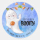 Celebrate the Halloween tradition of “You’ve Been Booed” with this playful ghost sticker. Featuring a watercolor-style ghost holding candy against a starry blue background with festive banners, this design is perfect for sealing treat bags, decorating gifts, or adding a cheerful touch to boo baskets.