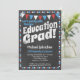 A fun and unique education graduation party invitation in chalkboard style with red, white and blue flags and a whimsical polka-dot border with dots on the back.