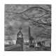 Old stone headstones mark graves in Laurel Hill Cemetery. Historic cemeteries can have goth, eerie, or spooky qualities to them. This black and white photo casts a stark, bleak, creepy light on the necropolis. Some find cemeteries scary, frightening, or macabre. Others find cemeteries peaceful and beautiful. Tree branches arch over the graves in this section of the graveyard.