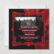 The invitation presents a chilling theme with a baroque-style blood-red frame that encapsulates the essence of a classic murder mystery event. The central image shows a silhouetted mansion set against a dark, foreboding sky, suggesting an evening of thrilling intrigue. The contrast of the red against the black background adds to the ominous atmosphere, promising a night where guests will be immersed in a suspenseful narrative to unravel a fictitious crime. The Gothic font and shadowy trees hint at the timeless appeal of detective stories, inviting participants to step into a world of puzzles and secrets at a grand estate where every corner holds a clue.