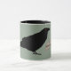 Mug with my original digitally created image of a raven or crow. The raven is ink black with blood-red eyes. He holds a chain in his mouth from which hangs a time-worn note reading "Nevermore". He stands against a grayish-green background with fine, tone-on-tone, wavy lines. A very literary way to enjoy your coffee or tea at Halloween or most any other time. This design can be used on any of a number of different mugs, glasses and steins.