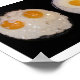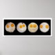 Photograph of four egg faces created by frying two eggs in a cast-iron pan.