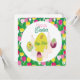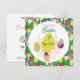 Cute bunnies with easter eggs on lovely tulips pattern background with holiday mood.