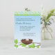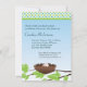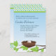 A bird egg is waiting to hatch and the little one is ready to make its debut, but first it's time to celebrate the mother-to-be. The nest on a leafy branch is complemented by the blue and green polka dot border at the top. The border is repeated on the reverse to offset any extra information needed. However, the egg has hatched and the empty eggshell is left to add a bit of whimsy to an adorable baby shower theme. Available with matching products