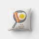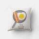 A throw pillow with a cute brekkie bacon and sunny side up egg in heart shape on a kitchen saucepan. Pun text reads "We are Eggcellent together!"