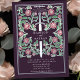 Set the tone for your mediaeval fantasy wedding with a bold invitation design—a grand sword surrounded by florals against a eggplant background. Perfect for couples dreaming of an epic, romantic celebration. Personalise it for your needs. NOTE: The silver featured in this design is NOT real foil.