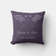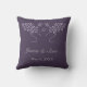 A throw pillow to customise with your wedding date. Insert the bride and groom's names. Two tree branches intersecting with lilac leaves on a dark eggplant purple background. An everlasting memory of your wedding day.
