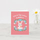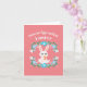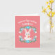 The main focus of the card is the Easter bunny, depicted in a playful pose, holding an intricately decorated Easter egg. The bunny's ears stand tall, conveying a sense of alertness and excitement, as if eagerly anticipating the egg hunt festivities.