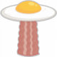 Vector cartoon illustration of a delicious sunny side up fried egg UFO with a yummy bacon slice tractor beam. Keywords: egg, bacon, breakfast, UFO, alien, sunny, side, cartoon, space, extraterrestrial, food, cute, yolk, sci-fi, science, fiction, martian, humour, meat, pork, abduction