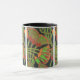 A very stylish white coffee mug with a black rim and handle and three panels of a traditional Egyptian design, from a silk-screenprint by Judy Adamson. This design is also available on a variety of gifts and apparel.
