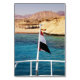 Egyptian flag of the pleasure yacht "Panorama" on the background of the azure water of Red sea and parking cars