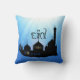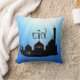 Black silhouette of a mosque on a blue sky with sun and sunrays, greetings and wishes for Eid.