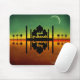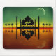 Eid Mubarak greeting illustration: a mosque and palms silhouette on a night sky background with the moon and stars reflecting on water.