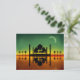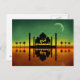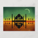 Eid Mubarak greeting illustration: a mosque and palms silhouette on a night sky background with the moon and stars reflecting on water.