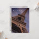 A dinner party invitation with a french theme. Photograph of the Eiffel Tower taken at an angle giving it an interesting perspective.