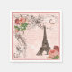The Eiffel tower and pink roses are on a soft pink background with French script writing.