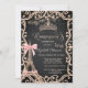 A modern, chic and glamorous invitation with an elegant gold tiara, dress, Eiffel Tower with pink bow, and glitter butterflies on a gray background.