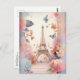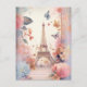 A postcard with a stylised Eiffel tower image surrounded by pretty butterflies and delicate garden flowers.