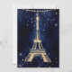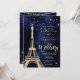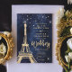 A modern, chic and glamourous romantic Paris theme wedding with a hand drawn gold glitter french Eiffel Tower with gold glitter diamond sparkles on a dark navy blue watercolor . Perfect for European destination wedding.