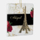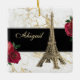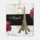This beautiful Eiffel Tower Christmas ornament design features a golden graphic of the Eiffel Tower on a black, white and gold marble background with red roses. Personalise the back with a name and year!