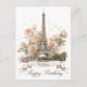 An elegant and romantic greeting card design featuring a beautiful watercolor-style illustration of the Eiffel Tower. The iconic Parisian landmark is surrounded by soft, pastel pink and cream roses and accented with delicate golden speckles. Customise with your own text the ribbon banner at the bottom display.