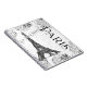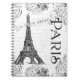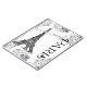 Black and white illustration of the Eiffel Tower and fancy scrolls. Paris is written in strong print on the side. Lovely design for gifts and cards.