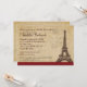 Start off a romantic Parisian themed bridal shower with a unique invitation meant to look like a postcard from a bygone era. The background is reminiscent of an aged letter with subtle engraving, cursive handwriting and visa and postage stamps. The Eiffel Tower is dominant on top of a maroon panel. The paper background is repeated on the reverse to highlight extra information for your guests. Available with matching products.