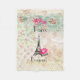 A blanket with a lovely vintage pattern background with faint roses and fleur-de-lis. Layered over top is an illustration of the eiffel tower. A hot pink lipstick impression beside the famous landmark which say xoxo! and fancy typography which says "love love love" Paris Bonjour! Text can be changed/customised to suit your needs.