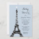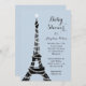 Sparkling twinkle lights decorate the Eiffel Tower on a soft blue background, on this Parisian inspired baby shower invitation.