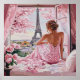 Add a touch of luxury to your home decor with a dreamy, romantic illustration capturing the quintessential Parisian spring. A woman, adorned in a soft pink gown, sits gazing out over the city skyline, where the majestic Eiffel Tower is beautifully framed by blooming pink cherry blossoms. This artwork, characterized by its soft palette and elegant mood, is perfect for adding a touch of sophistication, romance, and feminine charm to apparel, home decor.