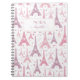 Eiffel towers illustrated in pink and purple with hand-drawn style hearts in a repeating pattern. Personalise with your name or message in purple font.