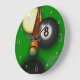 A fun design for those that like a game of billiards. Featuring a cue, the white ball and the eight ball on the table, whether playing for fun or in a team tournament you'll rack up the points with this cool clock design.