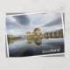 Photo postcard of historic Eilean Donan Castle on a quiet morning with reflection in the still water at the western coast of Scotland, near Isle of Skye with a white border and in white the text 'Scotland'. The image is a bit rotated to create the illusion of it laying loose.