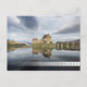 Photo postcard of historic Eilean Donan Castle on a quiet morning with reflection in the still water at the western coast of Scotland, near Isle of Skye with a fading bar and the text 'Scotland'.