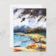 A seascape with a beach area in the foreground, calm turquoise water, and a range of mountains in the background. The sky is dynamic, with dark, heavy clouds contrasting with bright white and yellow accents, adding a sense of movement and drama to the serene landscape below.